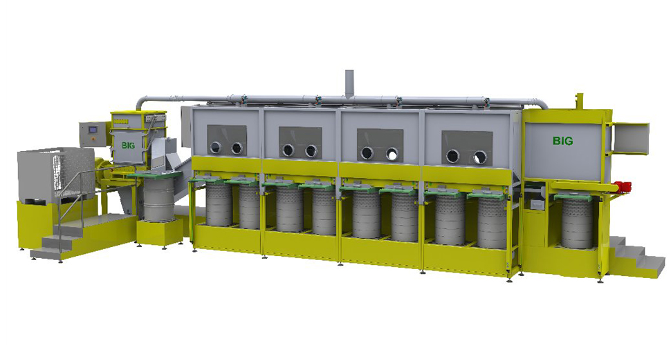Die Fässer werden an der Sortierbox angedockt, um den Abfall, der nach dem Sortieren durch die Löcher in die entsprechende Fass zu erhalten. Der sortierte Abfall wird, in der Regel, im 200l Fässer für trockenen oder nassen verdichtbaren Abfall und in die 400l Fässer für nicht verdichtbaren Abfall sortiert. Pneumatisch angetriebene Dockingeinheiten sind vorgesehen Trommeln zu den Abwurf Löcher andocken und abdocken.